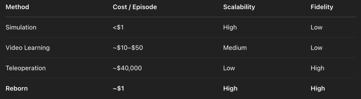 - Real-world data: Accurate, but requires teleoperation and a human in the loop, which is costly ($40K+ per robot) and lacks scalability.
