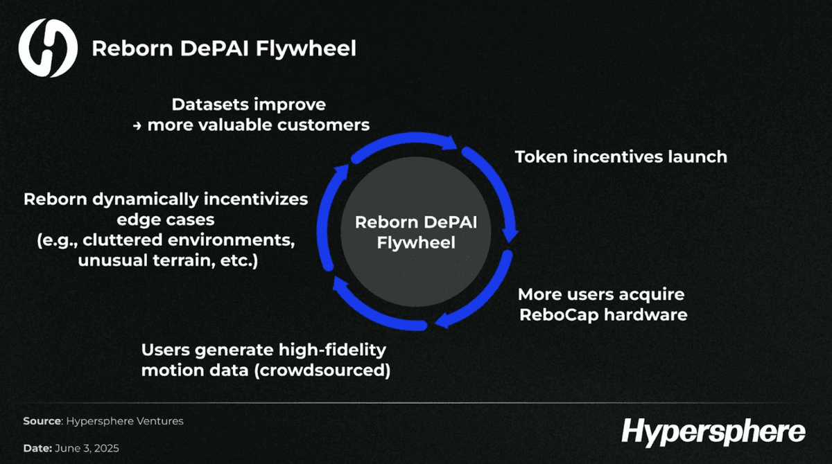 The fact that Reborn hasn’t launched a token yet makes its organic growth even more impressive. Once token incentives go live, network participation is expected to accelerate as a part of the DePAI flywheel: Reborn issues incentives for acquiring its hardware (the ReboCap), robotics companies pay ReboCap owners for their contributions, encouraging more folks to purchase and use ReboCap. Reborn will also dynamically incentivize high-value edge case behaviors – ensuring even better coverage of the Sim2Real gap.