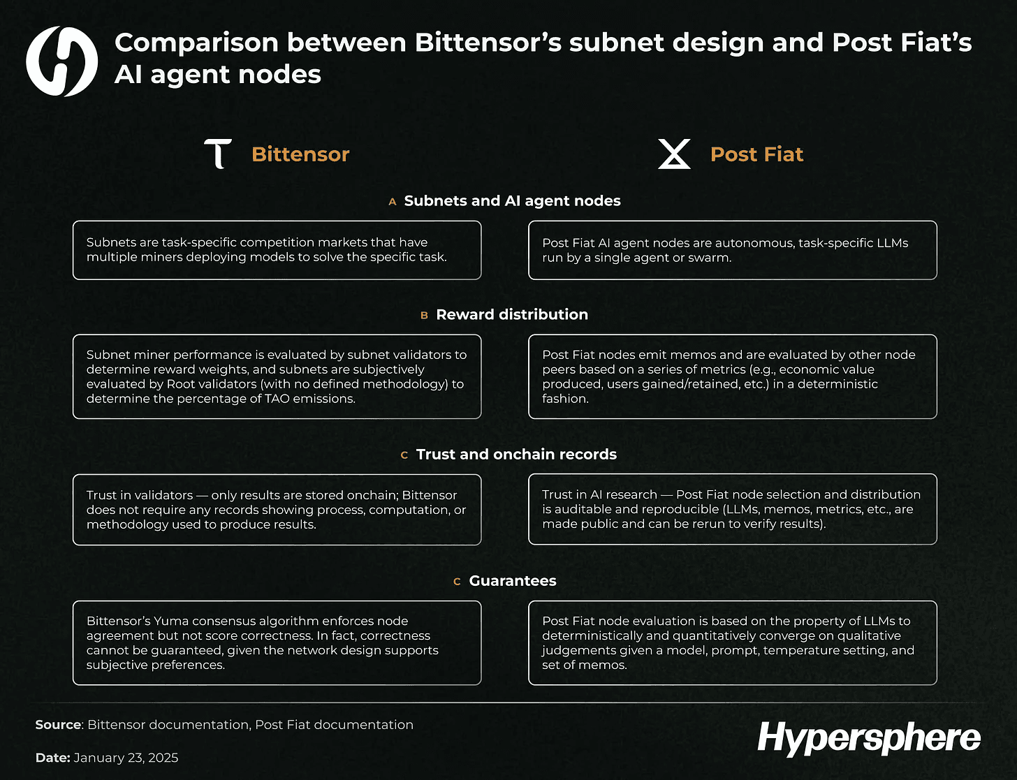 We expect Post Fiat to eventually surpass Bittensor in both usage and value. Though the Bittensor community is planning an upgrade that would distribute the decision-making, it has yet to show any interest in supporting deterministic processes, which are more trustless, efficient, and fair. Even if it did consider this route, it would be structurally difficult to implement due to how Bittensor’s network security is constructed.