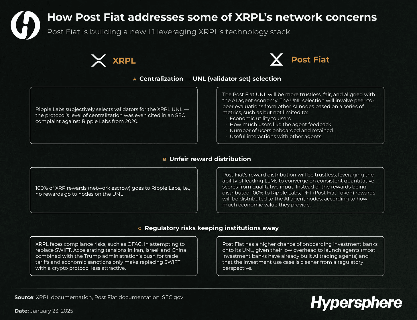 Please note that both Hypersphere Ventures and the author are investors in Post Fiat (PFT), which may create a conflict of interest. All opinions expressed are solely those of the author and are not intended to represent the views of any other entity. Investment in cryptocurrencies and blockchain-related projects carries significant risks, including the potential for substantial losses. Always conduct thorough due diligence and consult a licensed financial advisor before conducting any investment activities.
